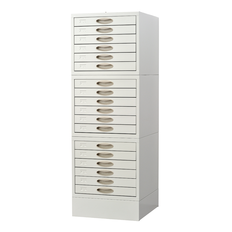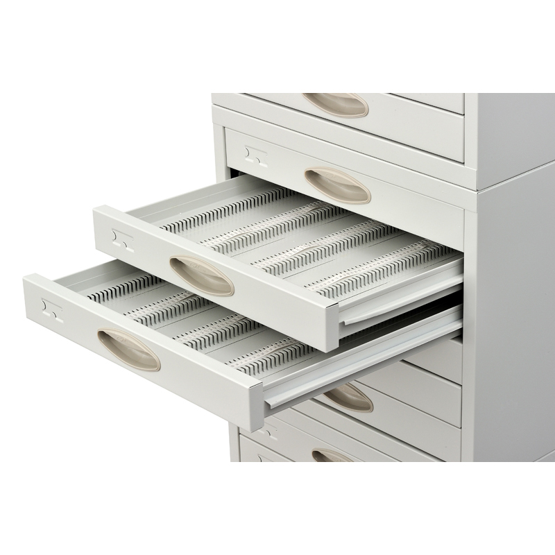 The base is made of SPCC1.2cold-roll steel sheets,the main body and drawers are made of SPCC 0.8 cold-roll steel sheets.This cabinet includes a base and three modules on the top that contains 18 drawers(6 drawers in each module)that accommodate up to 9,000 microscope slides.Numbered labels inside the drawers make filing more convenient.